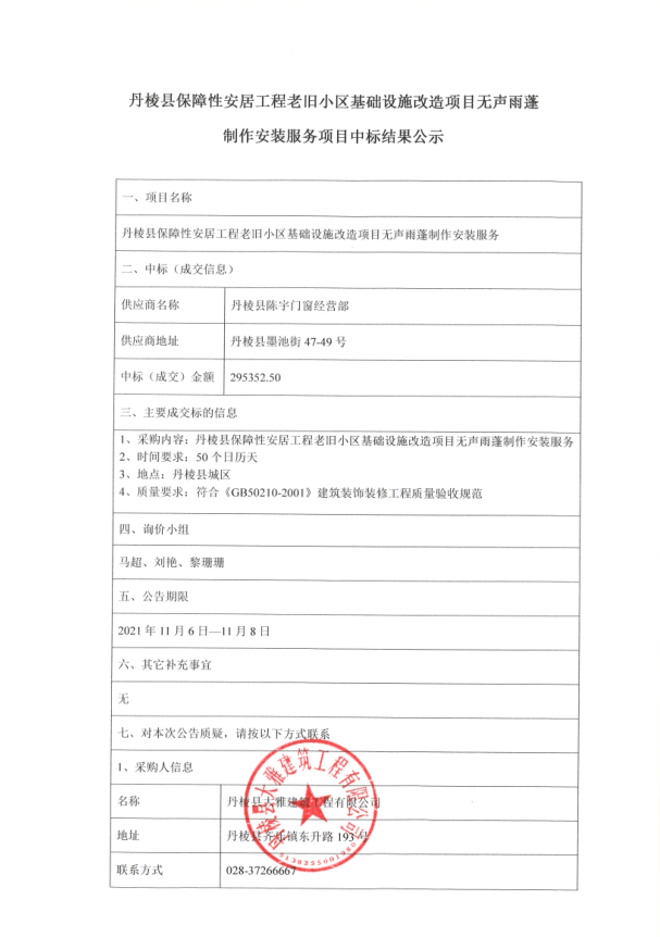 【大雅建筑公司】丹棱縣保障性安居工程老舊小區(qū)基礎設施改造項目無聲雨蓬制作安裝服務項目中標結果公示