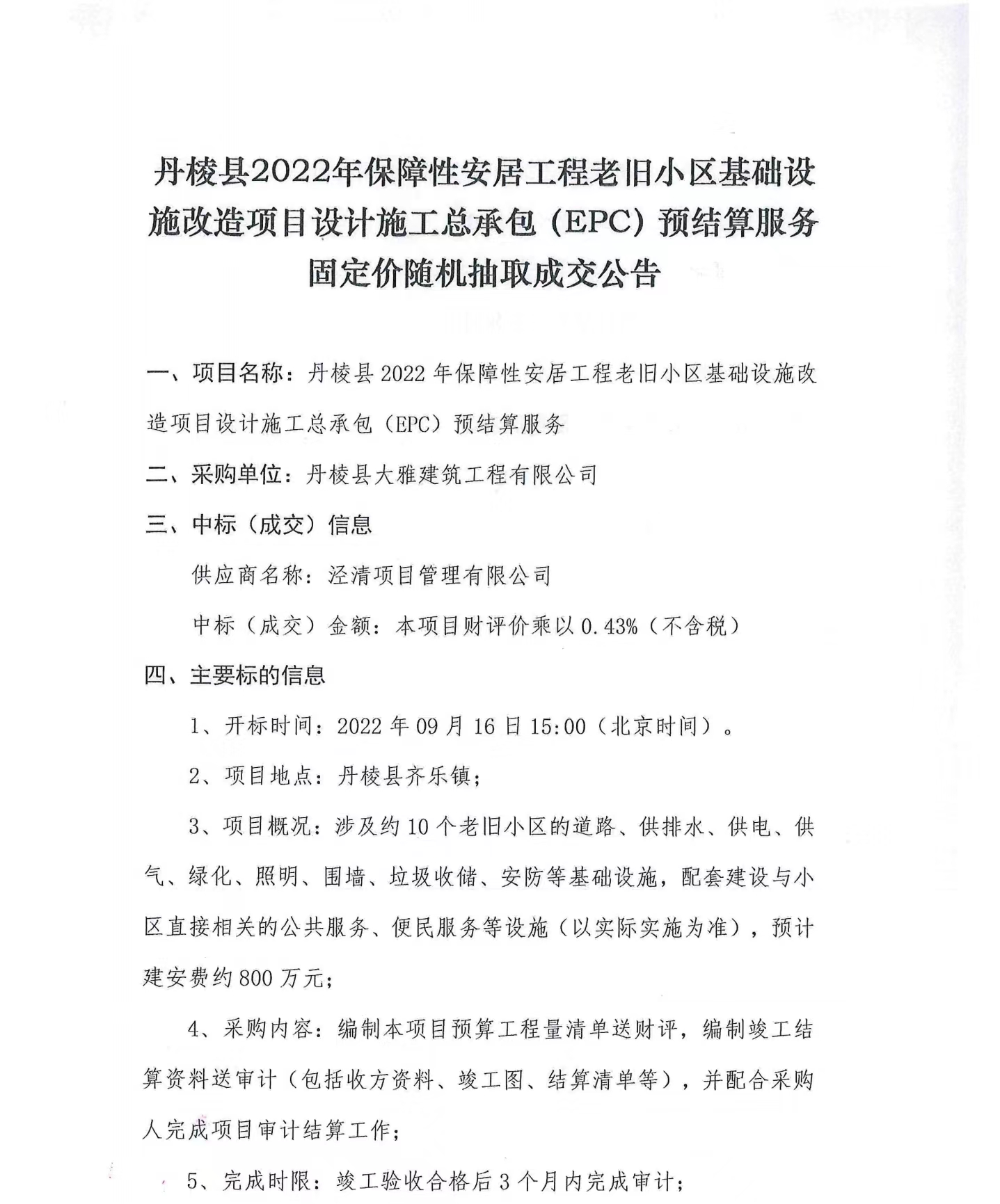 丹棱縣2022年保障性安居工程老舊小區(qū)基礎(chǔ)設(shè)施改造項(xiàng)目設(shè)計(jì)施工總承包(EPC)預(yù)結(jié)算服務(wù)固定價(jià)隨機(jī)抽取成交公告
