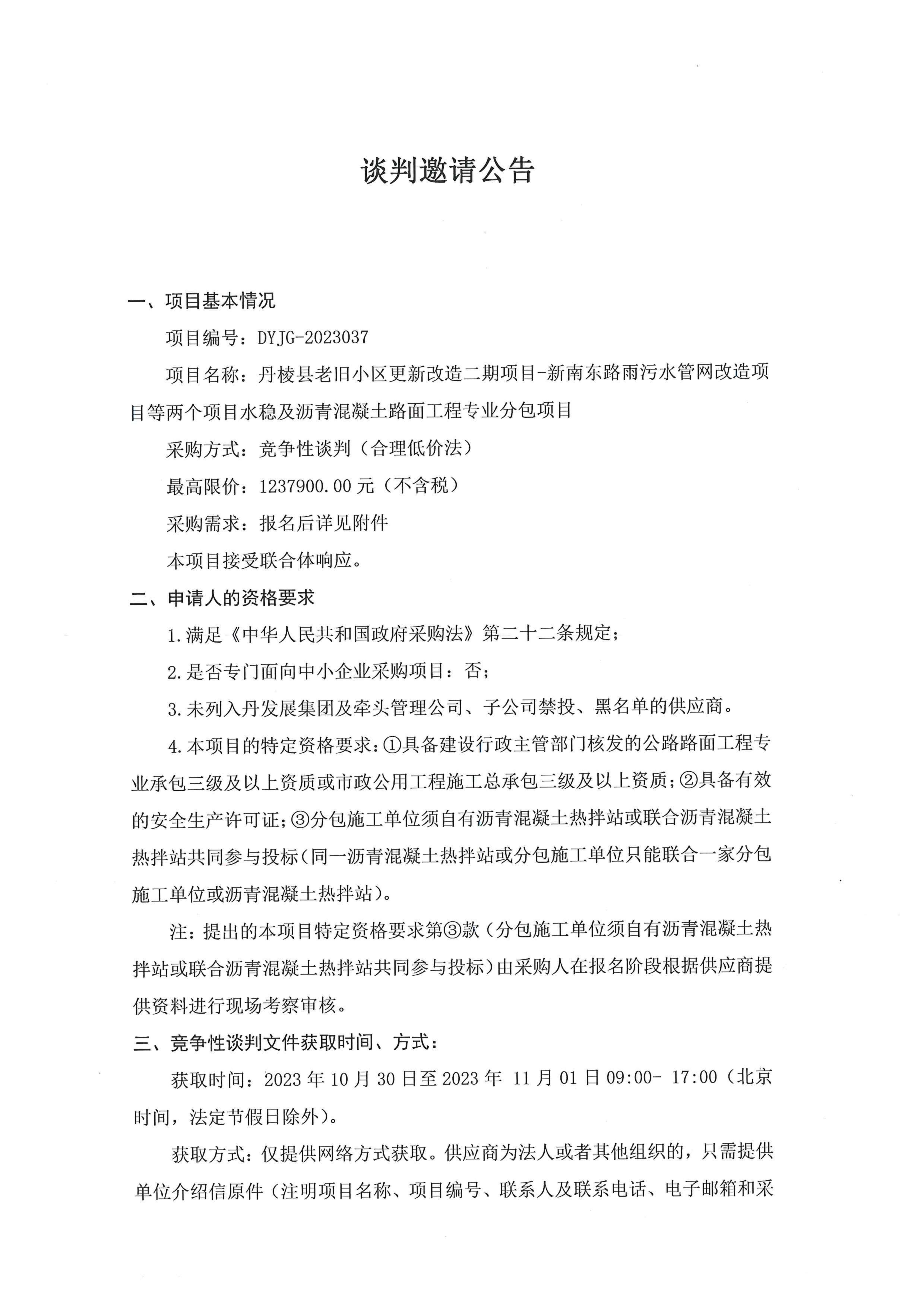丹棱縣老舊小區(qū)更新改造二期項目-新南東路雨污水管網(wǎng)改造項目等兩個項目水穩(wěn)及瀝青混凝土路面工程專業(yè)分包項目談判邀請公告