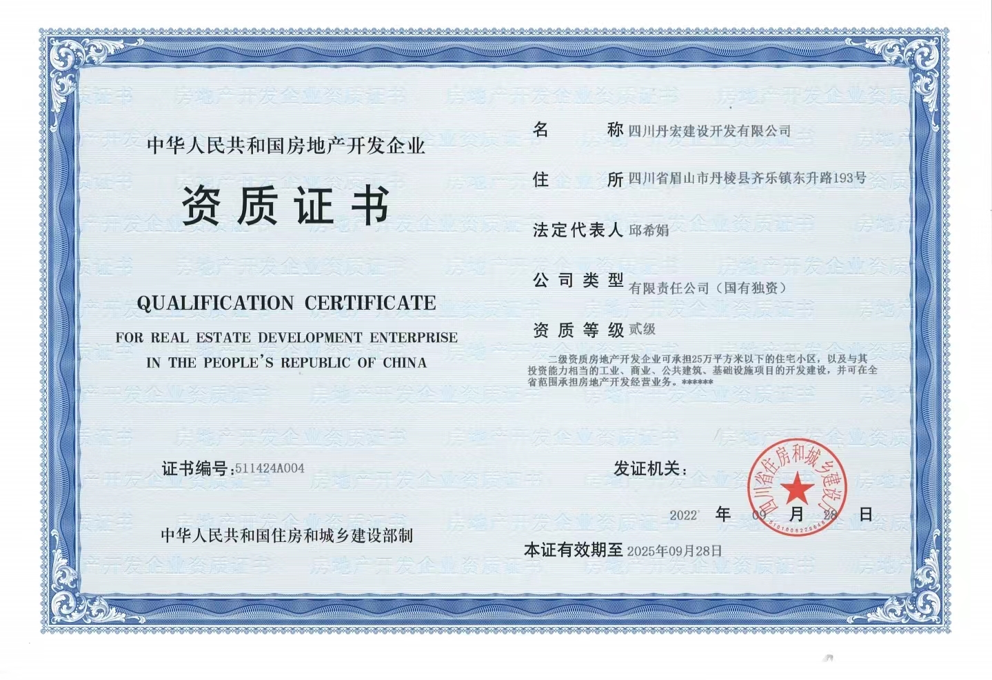 近日,丹發(fā)展集團(tuán)下屬的四川丹宏建設(shè)開發(fā)有限公司順利通過了四川省住房和城鄉(xiāng)建設(shè)廳資格審核,成功獲取了房地產(chǎn)開發(fā)二級(jí)資質(zhì)。標(biāo)志著丹宏公司可承擔(dān)建筑面積25萬平方米以下項(xiàng)目的開發(fā)建設(shè),并可在全省范圍承擔(dān)房地產(chǎn)開發(fā)經(jīng)營(yíng)業(yè)務(wù),為進(jìn)一步擴(kuò)大建設(shè)規(guī)模及開發(fā)區(qū)域奠定了堅(jiān)實(shí)基礎(chǔ)。