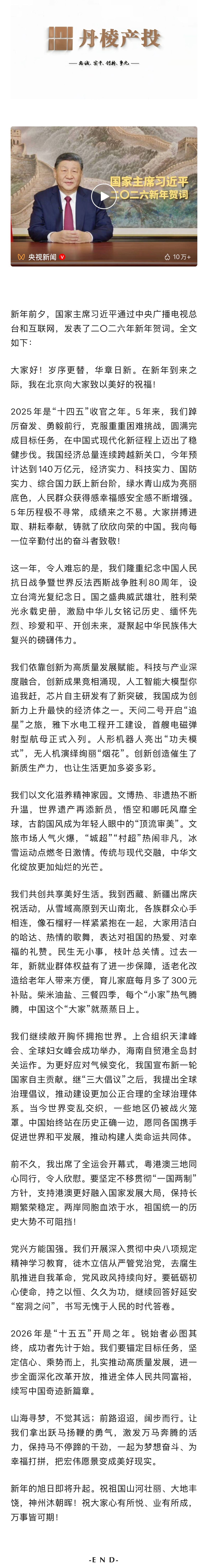 獨(dú)家視頻 | 國家主席習(xí)近平發(fā)表二〇二六年新年賀詞